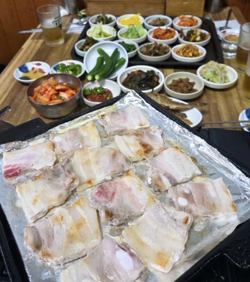 불판에서 지글지글 구워 고소하게 즐기고, 밑반찬들과 곁들이면 환상의 조합이에요!