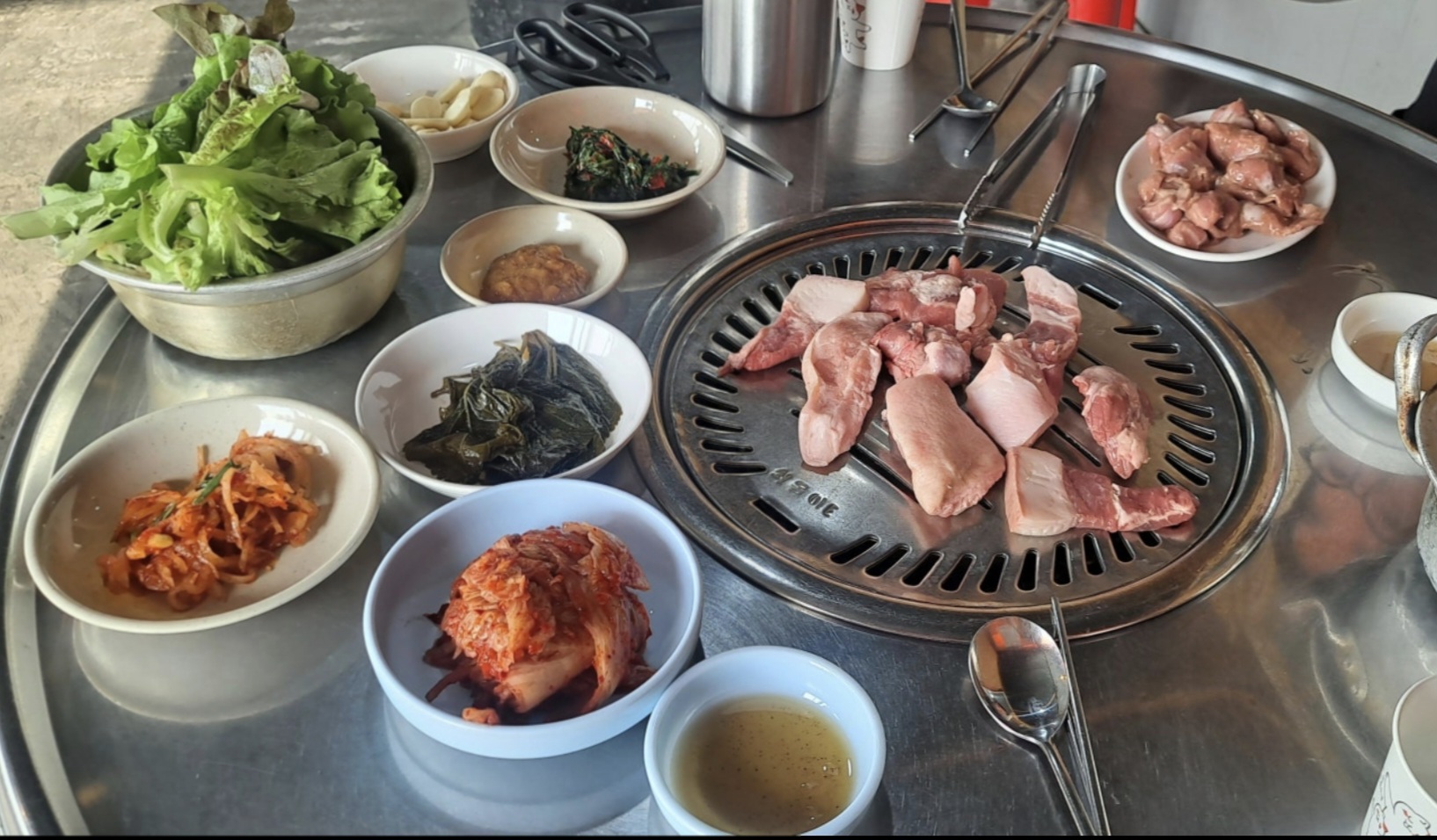 연탄불에 정성껏 구워진 고기와 정겨운 분위기까지,