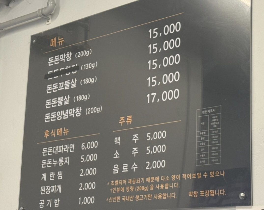 🥇 돈돈막창, 꼬들살, 뽈살, 두항정 (각 15,000원)