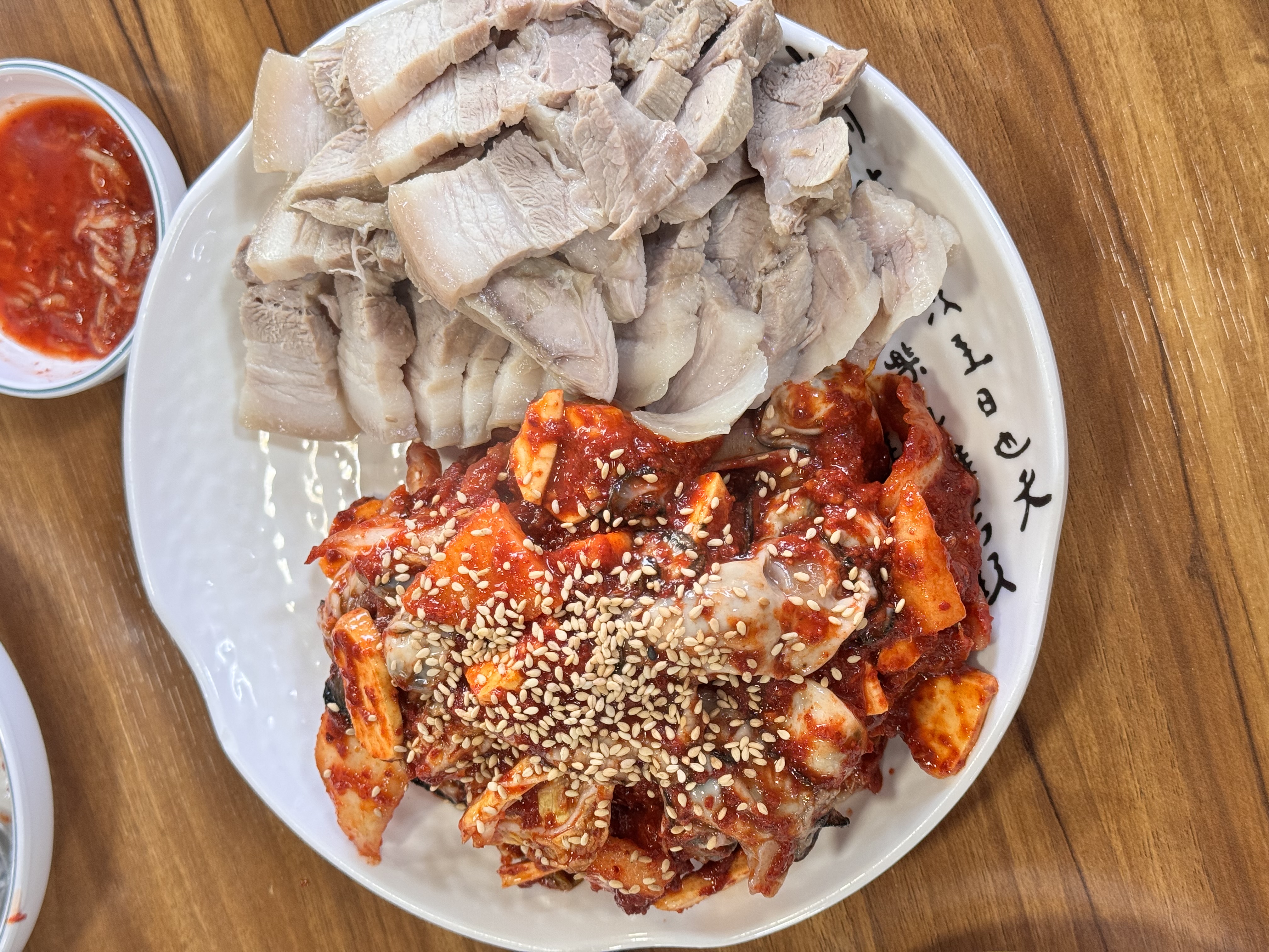 보쌈은 부드럽고 기름기 없는 돼지고기가 특징인데, 고기가 아주 부드럽고 입에서 사르르 녹습니다. 특제 쌈장과 함께 쌈을 싸서 먹으면 한 끼 식사로 완벽해요. 김치나 마늘과 함께 곁들이면 더욱 맛있고, 살짝 매콤한 맛이 칼국수 국물과 잘 어울려