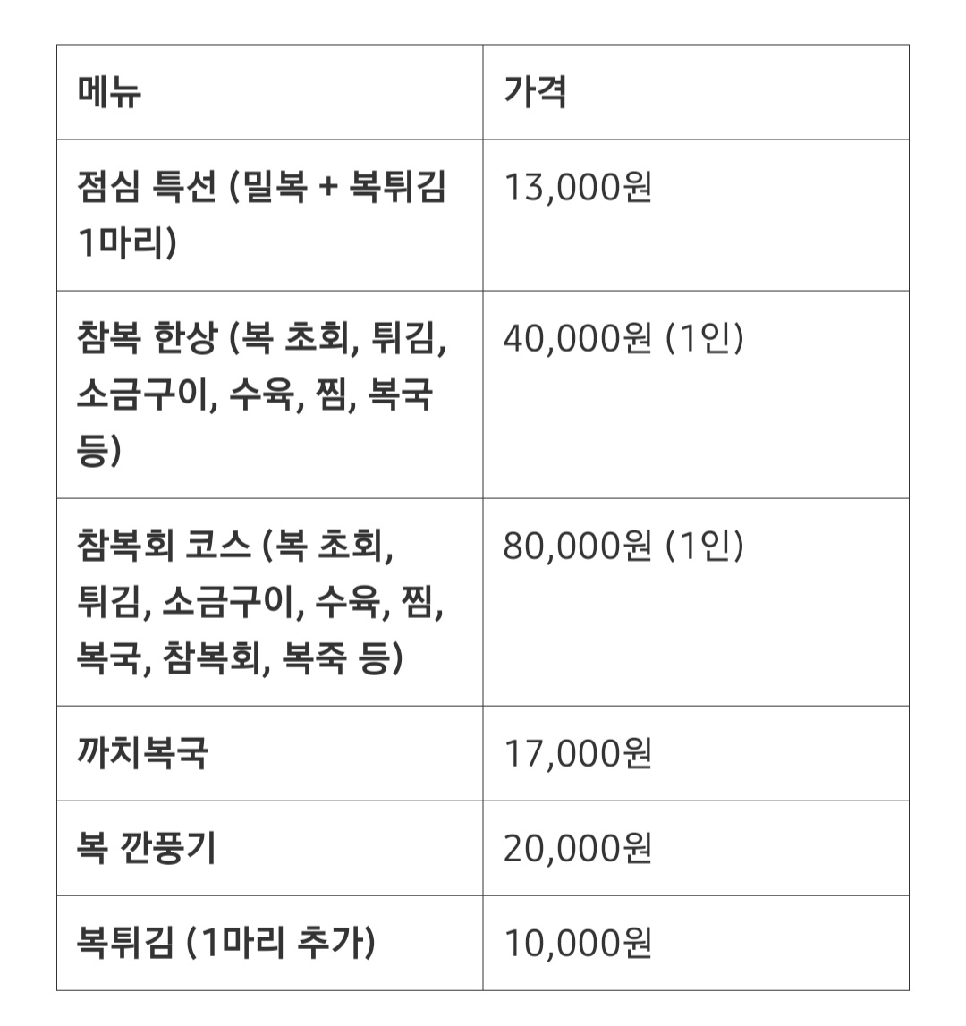 > 💡TIP: 참복회 코스는 신선한 참복회를 맛볼 수 있는 특별한 코스로, 예약 시 미리 문의하시는 것이 좋습니다.