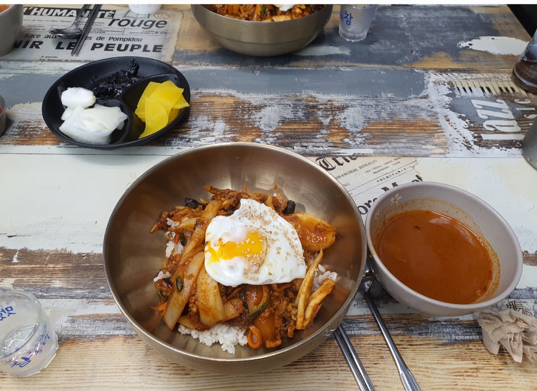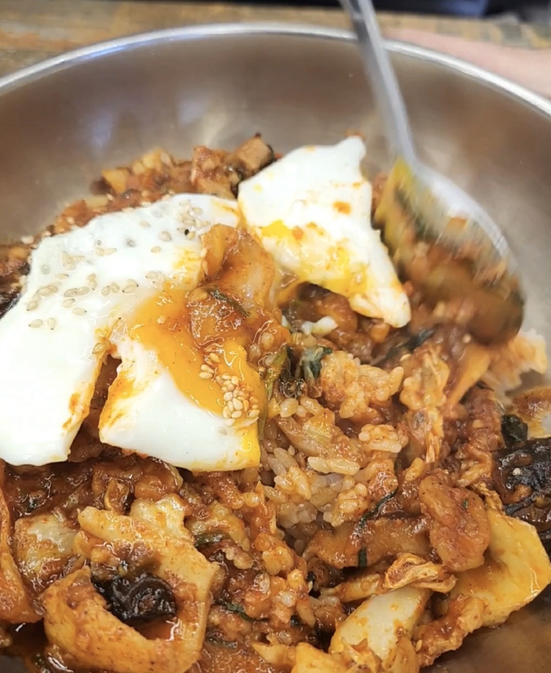 이곳에서 가장 유명한 메뉴로, 매콤한 양념에 오징어와 소고기를 불향 가득 볶아 채소와 함께 비벼 먹는 비빔밥입니다. 반숙 계란 프라이가 올라가 더욱 고소한 맛을 느낄 수 있으며, 함께 제공되는 짬뽕 국물과 곁들여 먹으면 더욱 완벽한 조합을 자랑합니다.