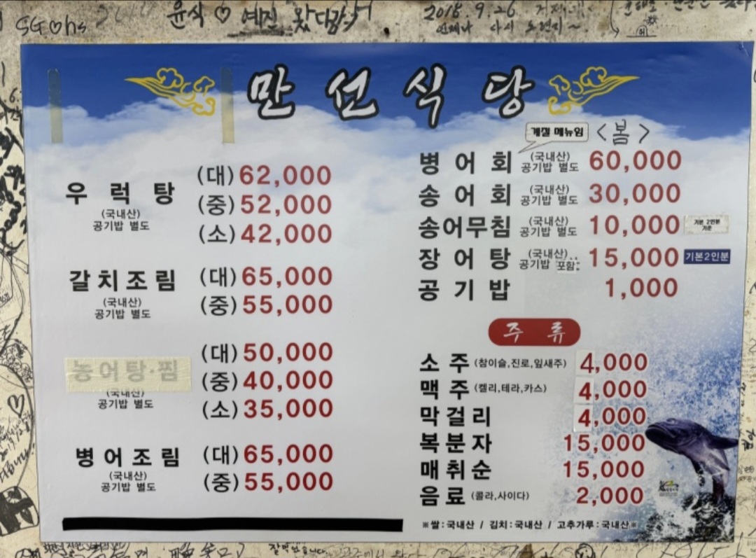 만선식당은 오랜 역사를 가진 노포로, 내부는 소박하고 정겨운 분위기를 자랑합니다. 벽면에는 손님들의 낙서가 가득해 오랜 세월을 증명하는데요. 직원분들은 친절하게 메뉴를 추천해 주고, 음식도 빠르게 제공되어 만족도가 높은 편입니다.
