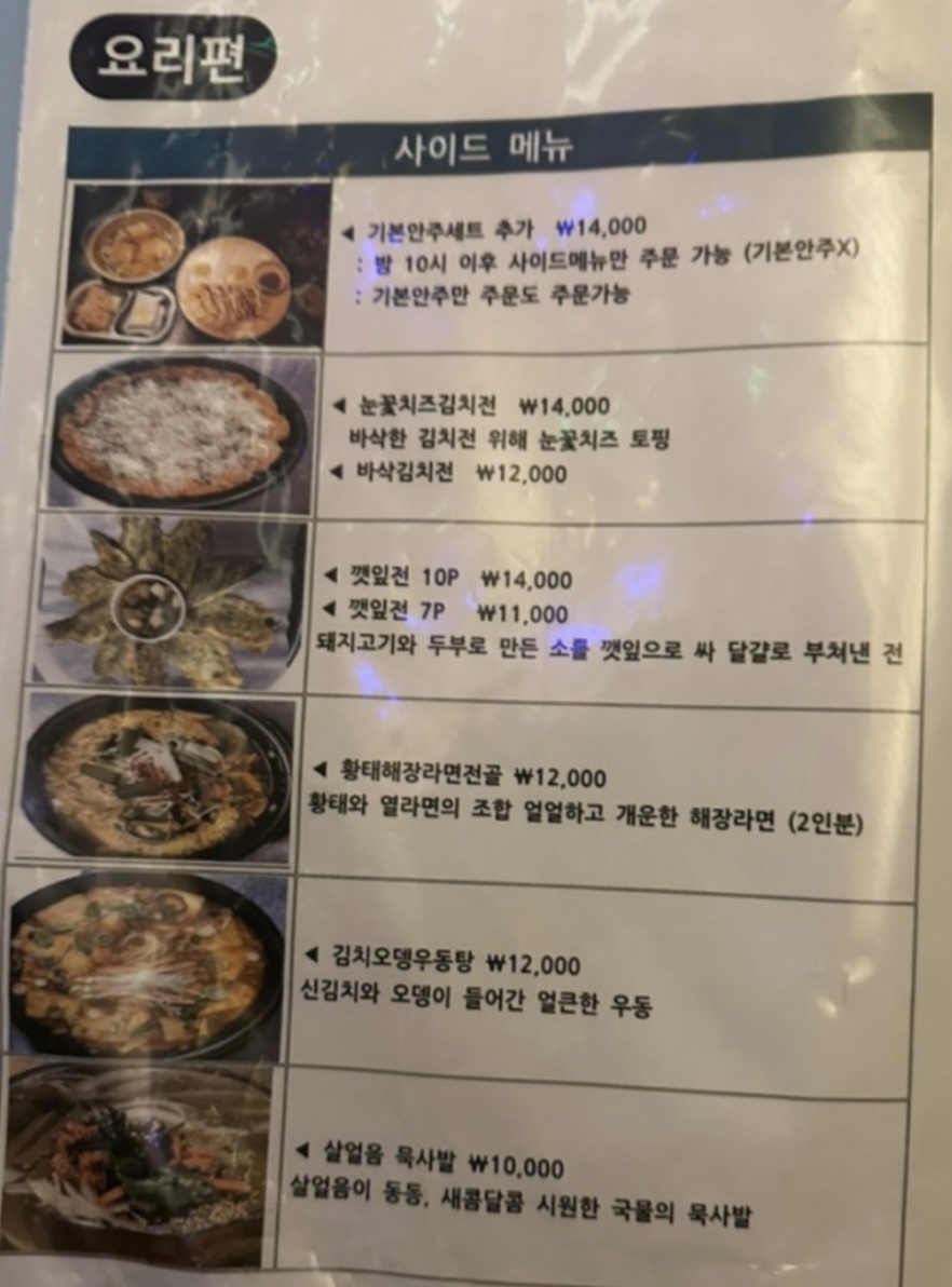 메인 안주 하나는 필수 주문이므로, 기본 안주 구성을 고려해 메뉴를 선택하면 더욱 알차게 즐길 수 있습니다.