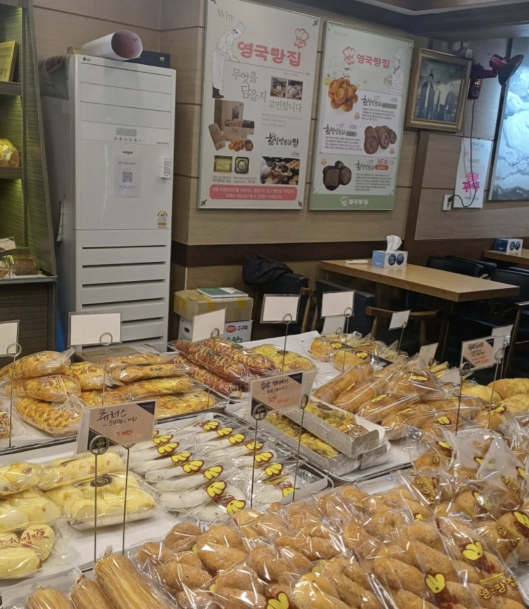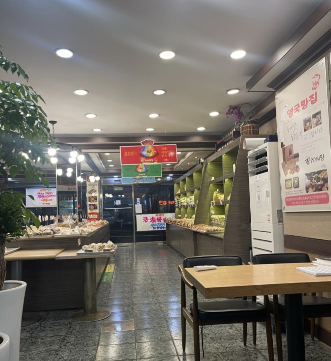 영국빵집은 전통적인 분위기의 베이커리로, 정갈하고 깔끔한 인테리어가 특징입니다. 입구에 들어서면 빵 냄새가 가득해 기분이 좋아지고, 내부는 아늑한 느낌을 주어 여유롭게 빵을 고를 수 있습니다. 특히, 모든 빵은 개별 포장되어 있어 위생적이고, 포장된 상태로도 맛있게 즐길 수 있습니다.